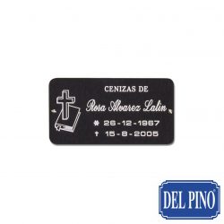 Placa de cementerio en aluminio negro brillo con forma 3. Medida 170 x 90mm. En el precio marcado entra 4 líneas para mas lineas ver Tarifa A página 19.