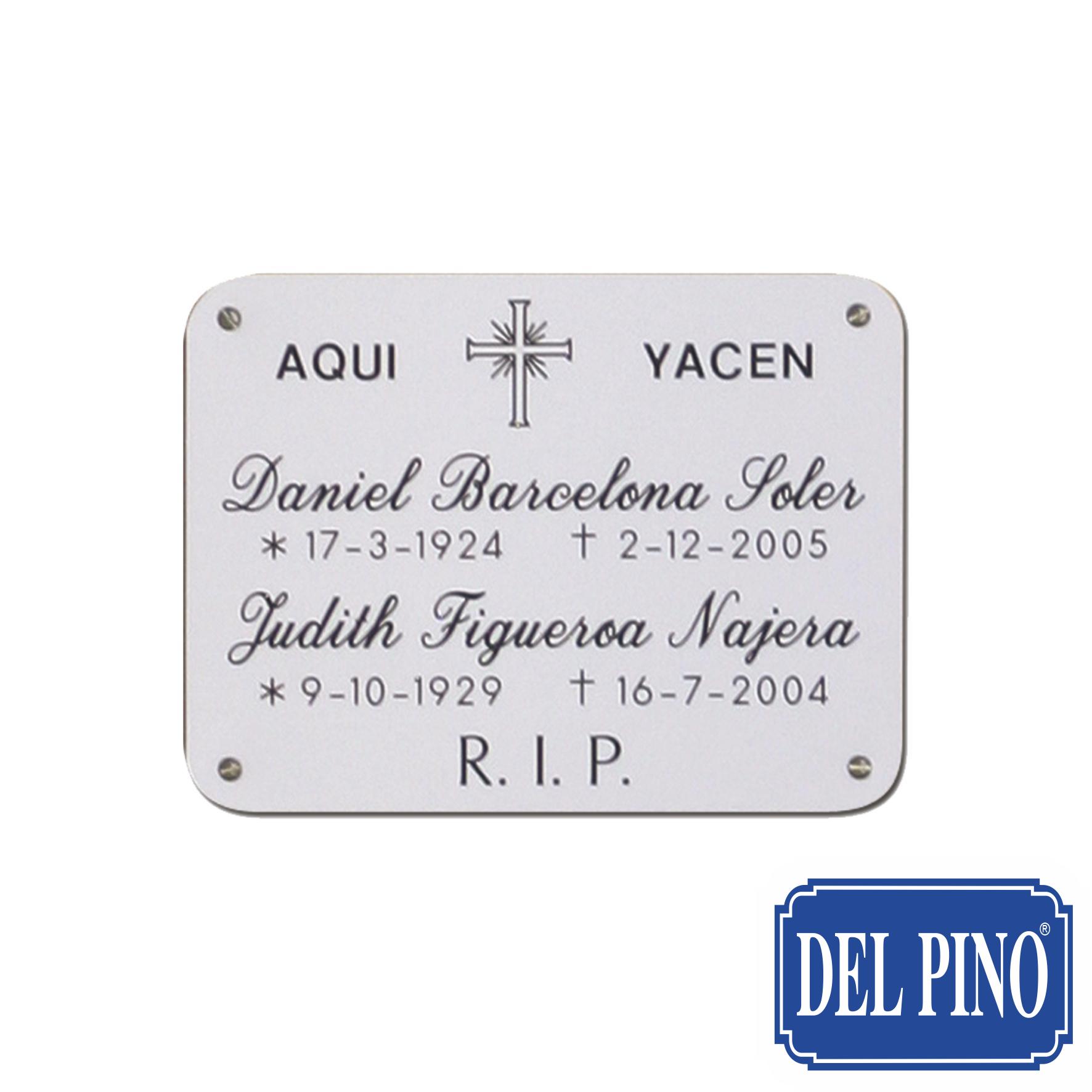 Placa de cementerio en aluminio plata brillo con forma 3. Medida 200 x 150mm. En el precio marcado entra 6 líneas para mas lineas ver Tarifa A página 19.