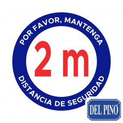 Rotulo adhesivo para suelo con el texto “Por favor mantenga distancia de seguridad 2m”