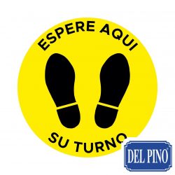 Rotulo adhesivo para suelo con el texto “Espere aqui su turno + logo de huellas”
