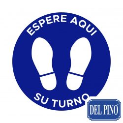 Rotulo adhesivo para suelo con el texto “Espere aqui su turno + logo de huellas”
