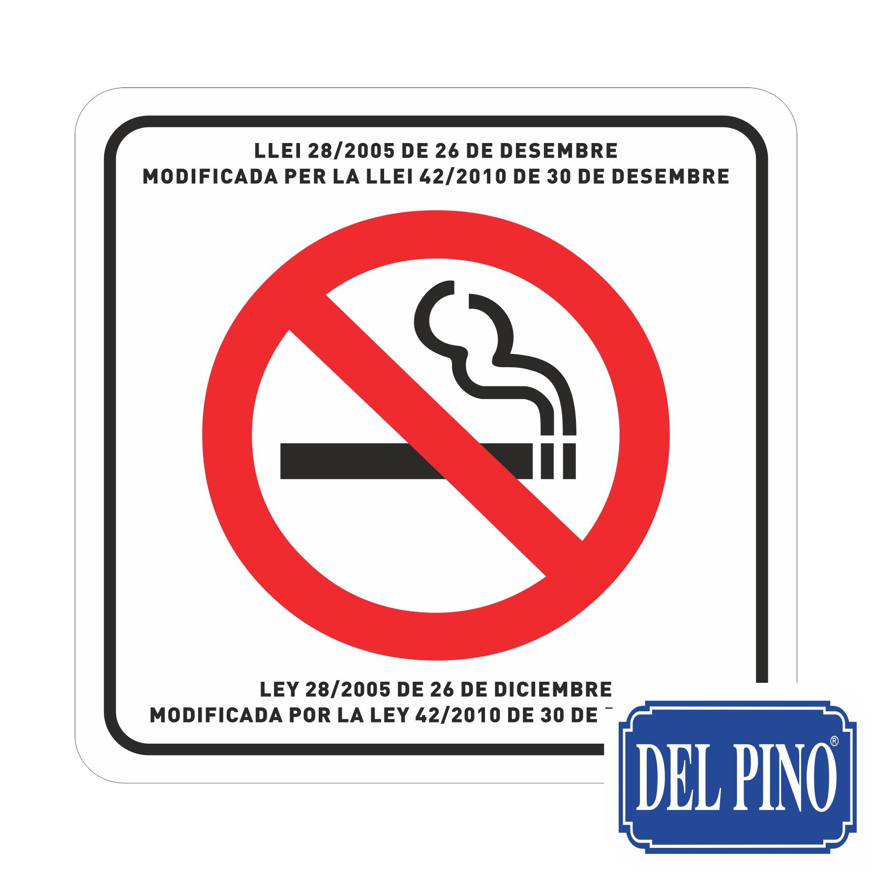 Señal Ley antitabaco: Logo de prohibido fumar Catalán y Castellano. Con referencia a la Ley 28/2005 de 26 de diciembre modificada por la Ley 42/2010 de 30 de septiembre.