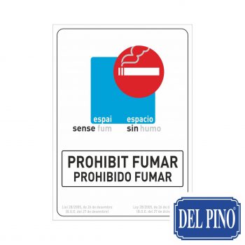 Señal Ley antitabaco: Espai sense fum prohibit fumar. Catalán. Con referencia a la Ley 28/2005 de 26 de diciembre modificada por la Ley 42/2010 de 30 de septiembre.