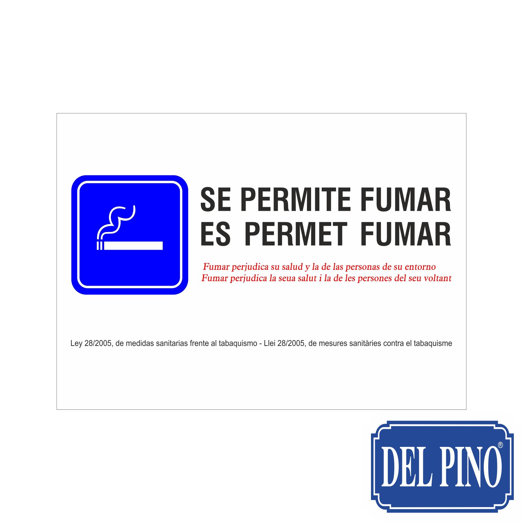 Señal Ley antitabaco: Se permite fumar y es permet fumar. Valenciano y Castellano. Con referencia a la Ley 28/2005 de 26 de diciembre modificada por la Ley 42/2010 de 30 de septiembre.