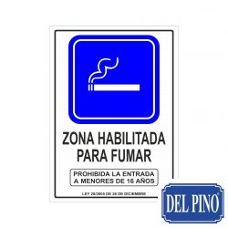 Señal Ley antitabaco: Zona habilitada para fumar prohibida la entrada a menores de 16 años. Castellano. Con referencia a la Ley 28/2005 de 26 de diciembre modificada por la Ley 42/2010 de 30 de septiembre.