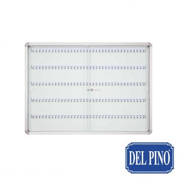 Armario mural para interior. Fondo acero blanco con 54 ganchos numerados para colgar llaves. Marco de aluminio anodizado plata mate con cantoneras redondeadas de plástico ABS gris. Puertas correderas de cristal templado 5 mm con cerradura. Medida 600×450 mm y fondo 50 mm. Vea precios en Tarifa B página 85.