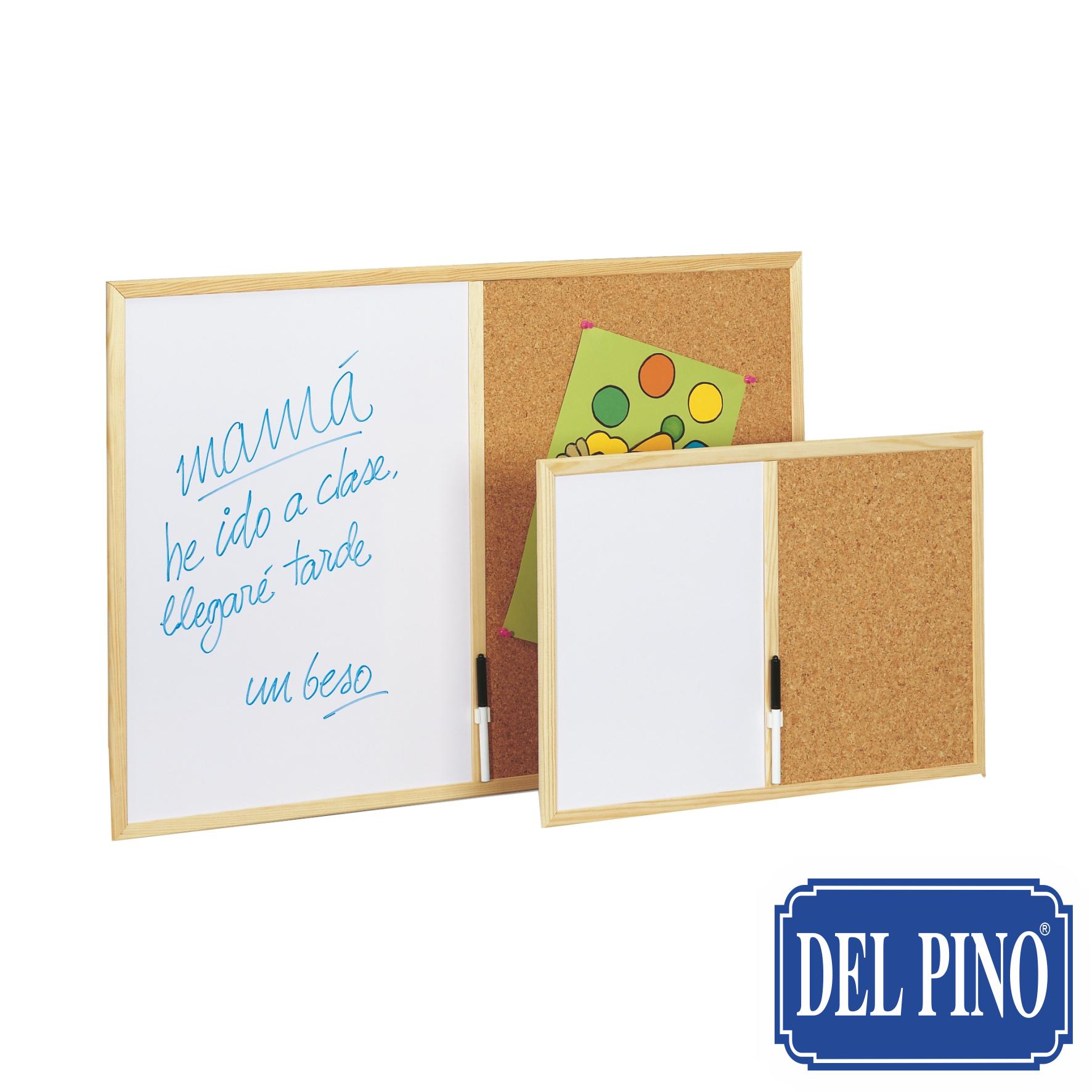 Pizarra con media superficie laminada blanca y la otra media de corcho con marco de madera de pino. Contiene elementos de fijación. Vea precios en Tarifa B página 87.
