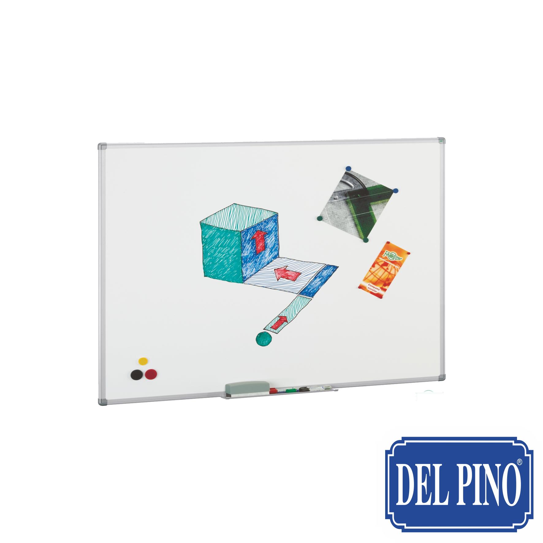 Pizarra laminada blanca con marco de aluminio plata. Garantía de superficie 25 años. Superficie metálica de acero vitrificado con marco de aluminio y cantonera decorativa. Útil para el trabajo con imanes o figuras magnéticas. Permite escritura con rotuladores especiales para pizarra blanca. Cajetín de aluminio de 40cm para rotuladores y borradores. Contiene elementos de fijación. Caja individual. Vea precios en Tarifa B página 87.