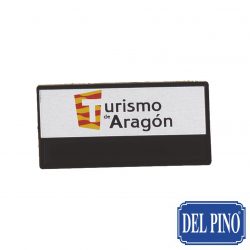 Imperdible de plástico inyectado blanco y negro con logos y textos en vinilo transparente con impresion digital o serigrafía y placa de aluminio plata mate. A 1 o 2 colores. Medida 74 x 34mm. PEDIDO MINIMO DE TRES UNIDADES. Ver precios en Tarifa A página 41.